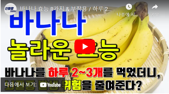무엇보다 바나나는 정말 많은 효능이 있어 추천하는 과일인데요. 먼저 글을 보기에 앞서 바나나의 놀라운 효능에 대한 이해하기 쉽게 설명한 영상을 보시면 좋을 것 같습니다.